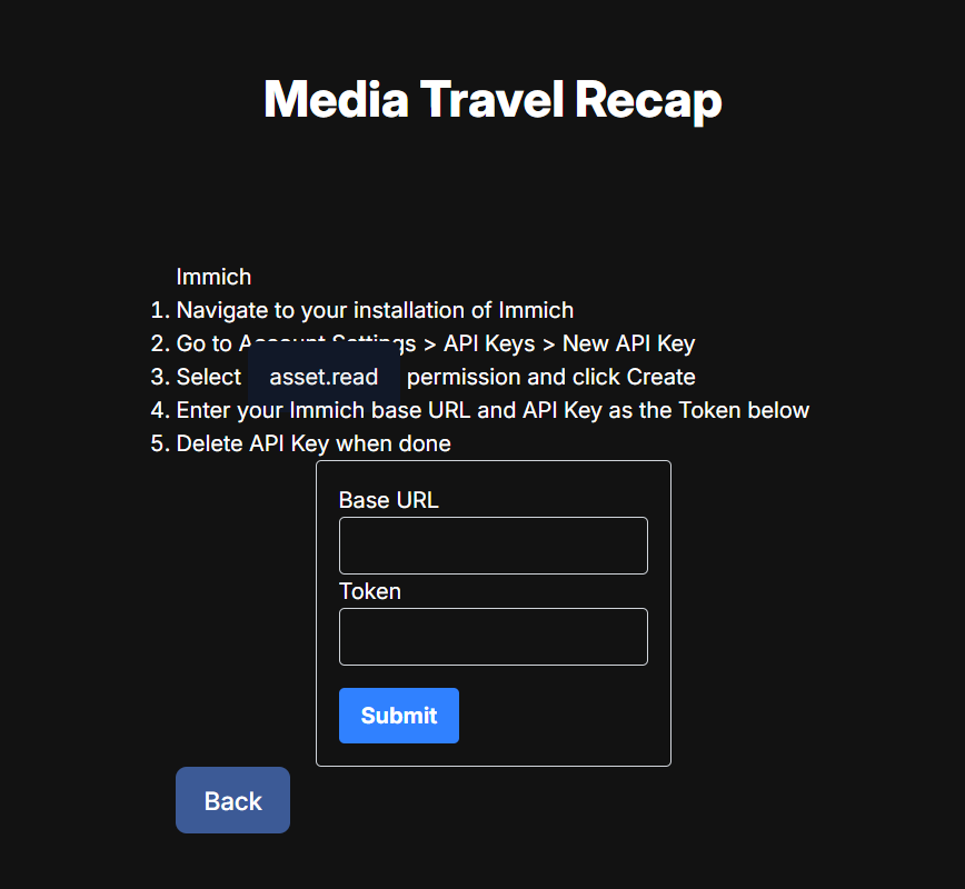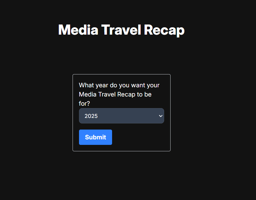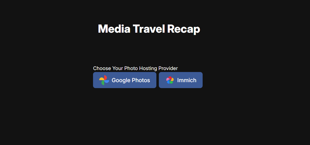 Media Travel Recap connects to your cloud photo storage to gather all photos and videos from a specified year and use the location and time metadata of the media to generate a "Travel Recap" based on where you've been that year. It compares the distance between each consecutive photo that was taken and determines whether or not you traveled somewhere new during that photo. For the recap, statistics are compiled, such as how many unique cities or states you have visited. Additionally, an animated map is generated, showing a visual of everywhere you have been. It currently works with Immich an account or Google Photos via Google Takeout.